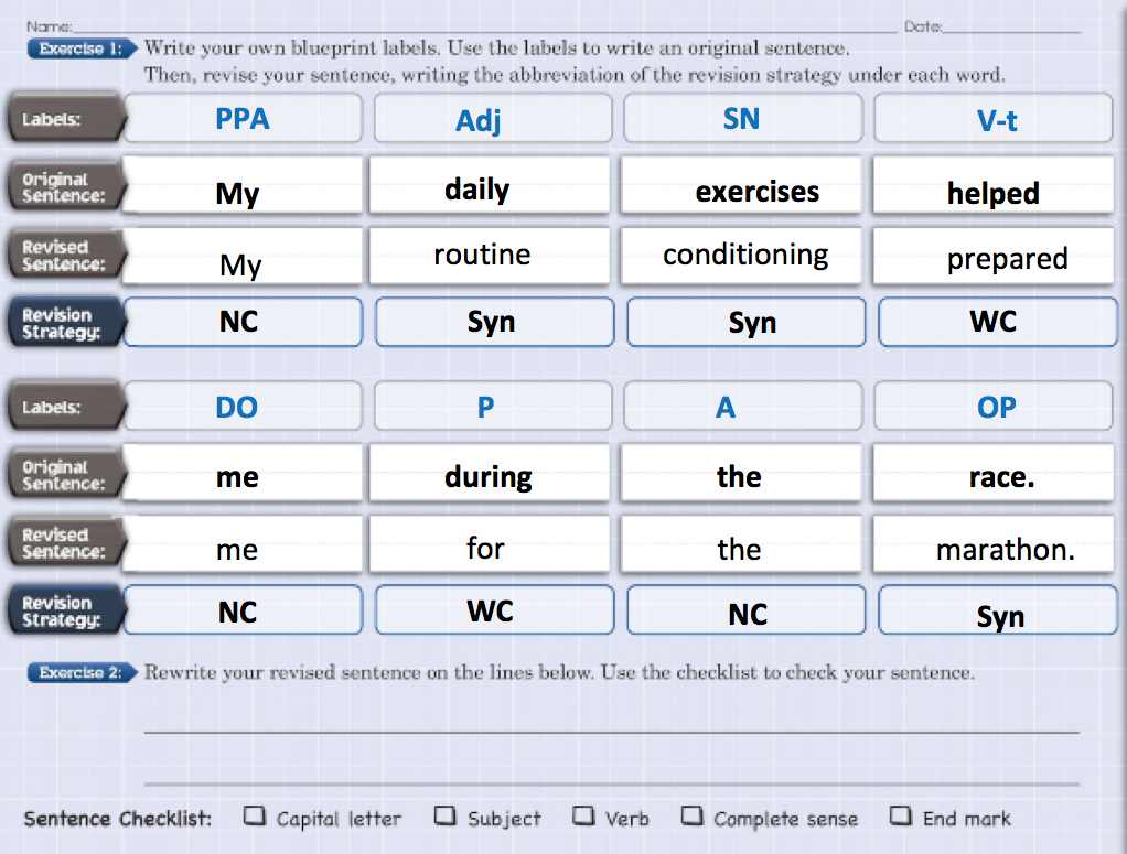 Sentence Blueprints are a unique feature in Shurley English. Writing Sentence Blueprints helps students make the connection between grammar and the writing process. Writing Sentence Blueprints from grammar labels establishes a foundation for sentence composition. Then, students learn to expand and improve their original sentences, using revision strategies to write improved sentences. In addition, Sentence Blueprints sneak in many other skills, including sentence analyzation and sentence sense work while the student is experiencing the power of revision as they focus on only one sentence.