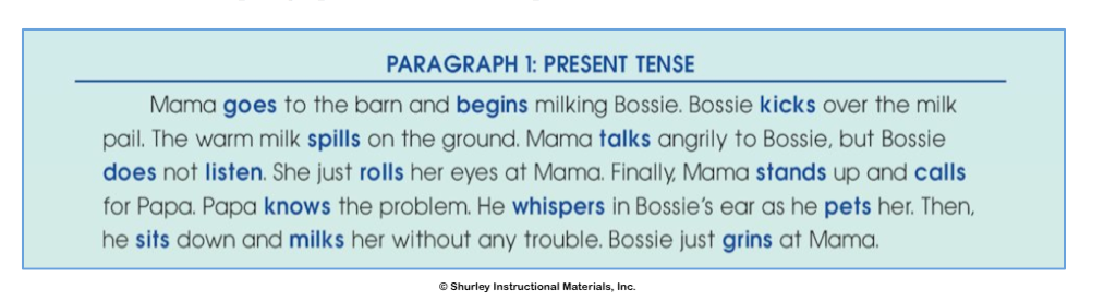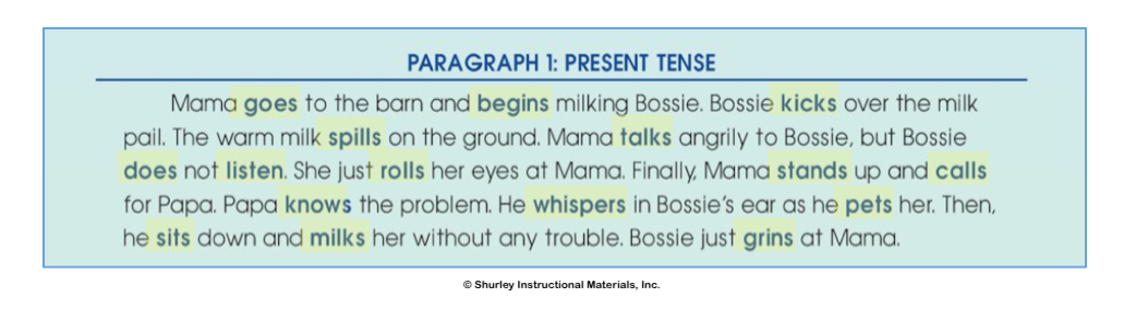 This activity purposely focuses students’ attention on the tense of each verb in the passage. It teaches students to use consistent tense to show actions that occur at the same time. If they want to change a present-tense paragraph to a past-tense paragraph, students learn that all they have to do is change each verb to past tense, one at a time!