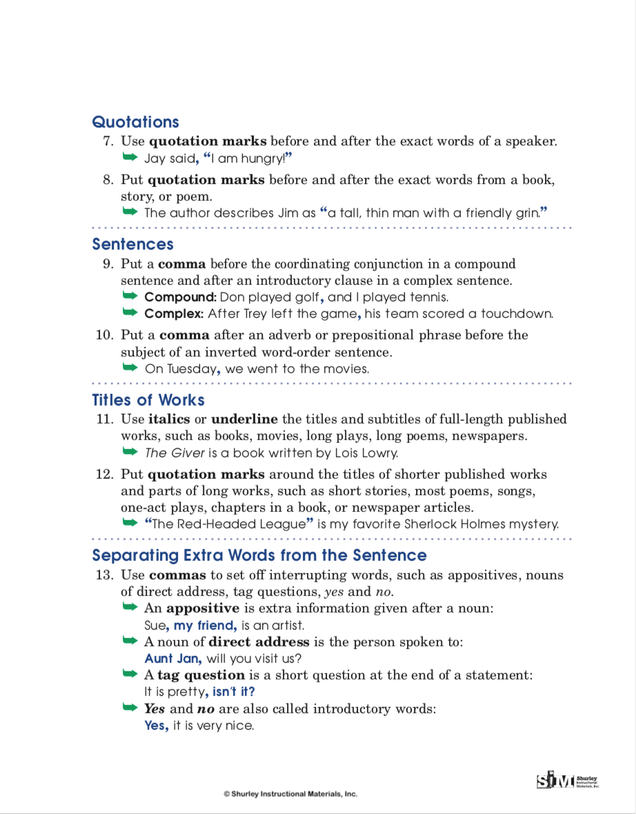 Capitalization and punctuation rules increase in complexity in each level of Shurley English. (I have provided you with reference lists from our level four text at the conclusion of this article.) The intention is NOT to have your students focus on memorizing all of these rules at once; the intention is to continuously EXPOSE them to capitalization and punctuation rules AND give students plenty of opportunity to apply the rules during editing exercises and writing assignments throughout the year. Applying the capitalization and punctuation rules over and over again in various exercises is the best strategy to help students commit these rules to memory.