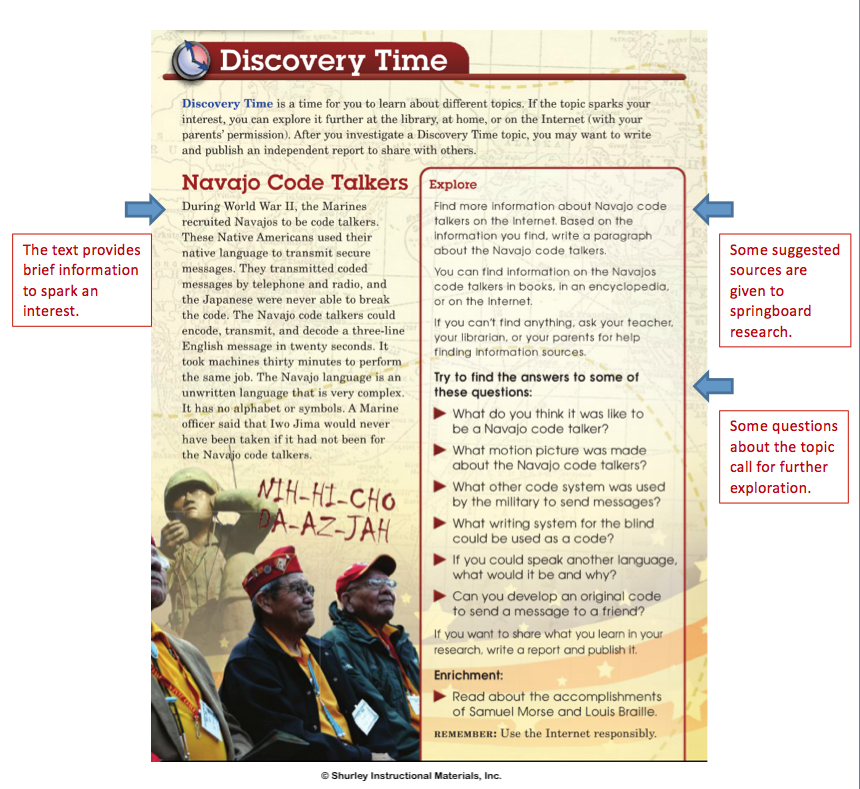 Discovery Time is strategically introduced and promoted in each grade level of Shurley English. Lessons are designed to spark students’ interest in self-guided research as a way to broaden their knowledge base. Of course, 40+ years of research proves that when learning new information about a topic, prior knowledge greatly impacts a students’ ability to comprehend, draw inferences, and figure out ambiguity. A broad base of knowledge also helps students think of new ideas related to the topic.