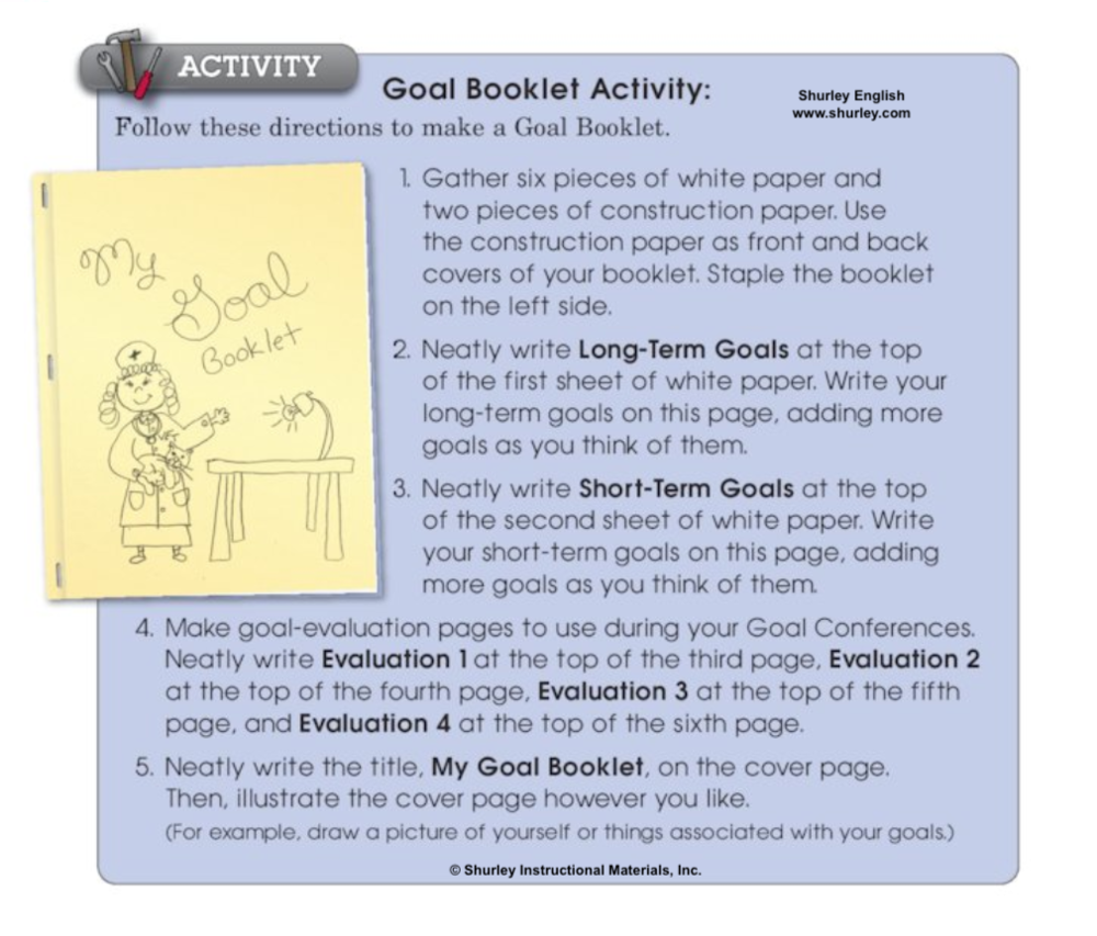 In Chapter 1, your students created short- and long-term goals. Guide your class through a discussion as they re-evaluate their goals and make adjustments where needed. Remind them that their goals will help keep them focused in the direction they want to go in the classroom and in life. Refer to Chapter 1, Setting Goals, in your Teacher’s Manual to review the original activity.