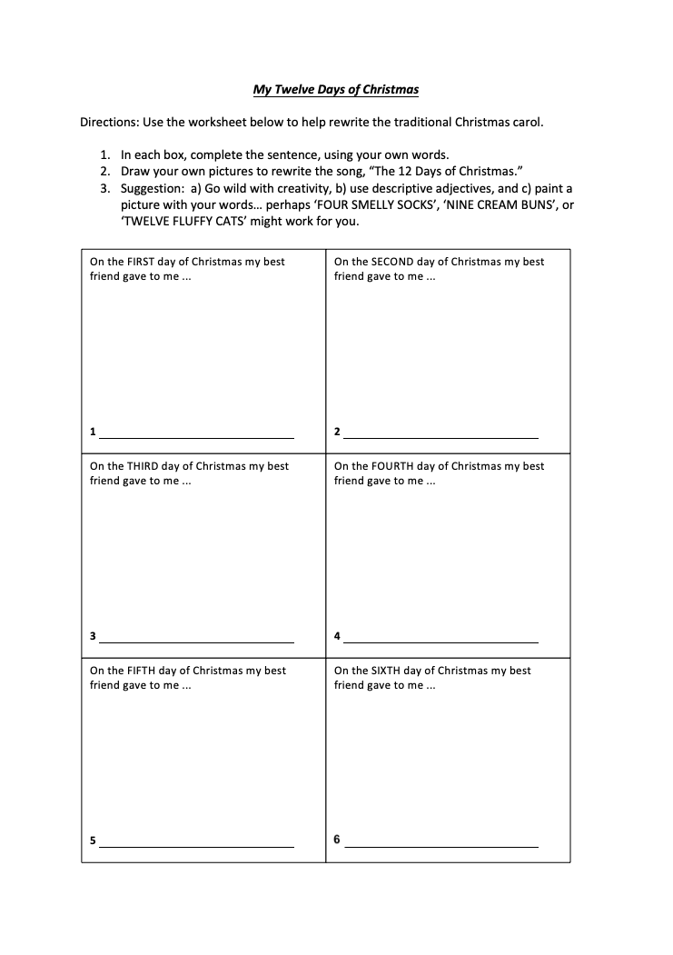 2. Draw your own pictures to rewrite the song, “The 12 Days of Christmas.”