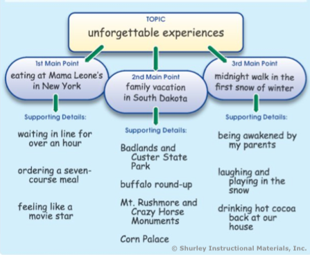 Students can begin with a topic, and then come up with two or three main points to tell about the topic. They will also learn to generate supporting details to provide more information about the main points.