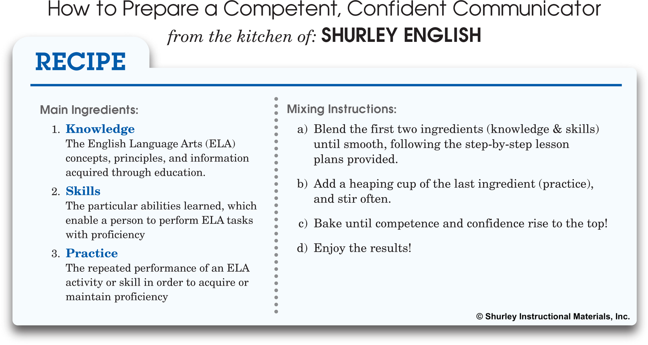 The following tested and tried Shurley English recipe has been preparing competent, confident communicators for generations. Make sure to follow it in your classroom!
