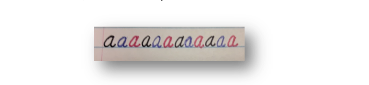They should practice writing only the lowercase A during the writing practice, and they will need to have all three colors of ink pens, markers, or colored pencils handy. Between each lowercase a, they will have to switch the color of their writing utensil. That adds another dimension to stimulate the sense of touch. If students write a whole base line filled with the color-coded lower case a’s, that makes what I call one whole practice line.