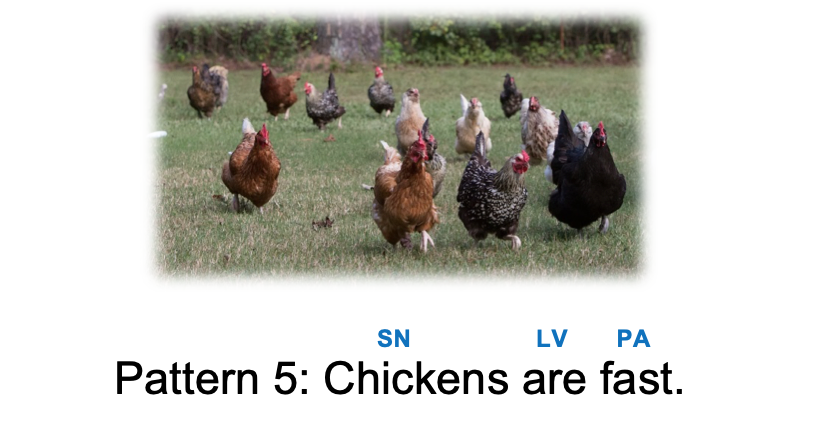 What kind of chickens? FAST! Fast describes chickens in this Pattern 5 example, even though the word fast is located in the predicate part of the sentence. It’s the linking verb that does the connecting.