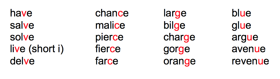 In each of the words listed, if the e WAS NOT THERE, it would leave a V, a C, a G, or a U, standing there—all alone—at the end of a word. It just isn’t supposed to happen! If it DOES happen, then students have a baseline of understanding that the particular word seems like an exception…well, it is—sort of. If you see that a word is ending in a V, C, G, or U and is NOT followed by an e, then we know something important about that word—it did not derive originally from English. It came to us from some other language. This becomes very important information, especially for young students who are trying to wade through spelling issues.