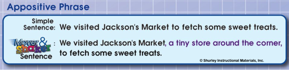Appositives are phrases that you set off with commas, and you usually position them just after the word you want described. The appositive is really just a renaming or modified version of the word it follows. Here is an example from one of the Mover and Shaker Sentence activities featured in Shurley English:
