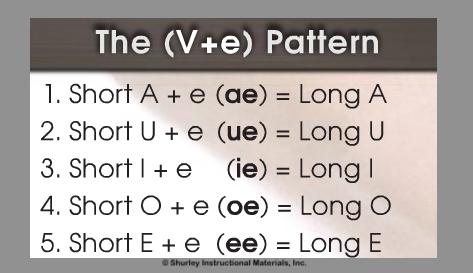 -When you put an e after any of the vowels, you will hear the first vowel say its long sound, and the e becomes a silent e.