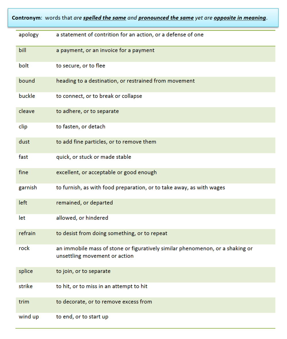You can give your students the knowledge, skills, and practice they need to know and use contronyms, starting with the list of contronyms below:
