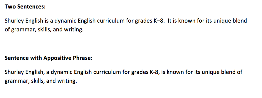 In the first example, the appositive is set off by commas to indicate that the appositive is not essential to the basic meaning of the sentence. If we drop the appositive, the meaning of the sentence will not change.