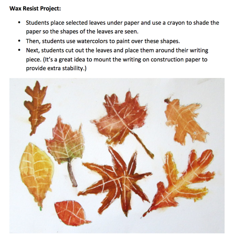 5. As they rewrite to create their final copy, and they think about the look of their finished piece, you may suggest various ways that they can decorate their works as they tap into their artistic side. For example, they could create a wax resist using leaves, crayons, white paper, and watercolors. (I have provided instructions for this project below.) Don’t forget to add a title! Here’s an idea if your students are stuck: “I am Thankful for You!”