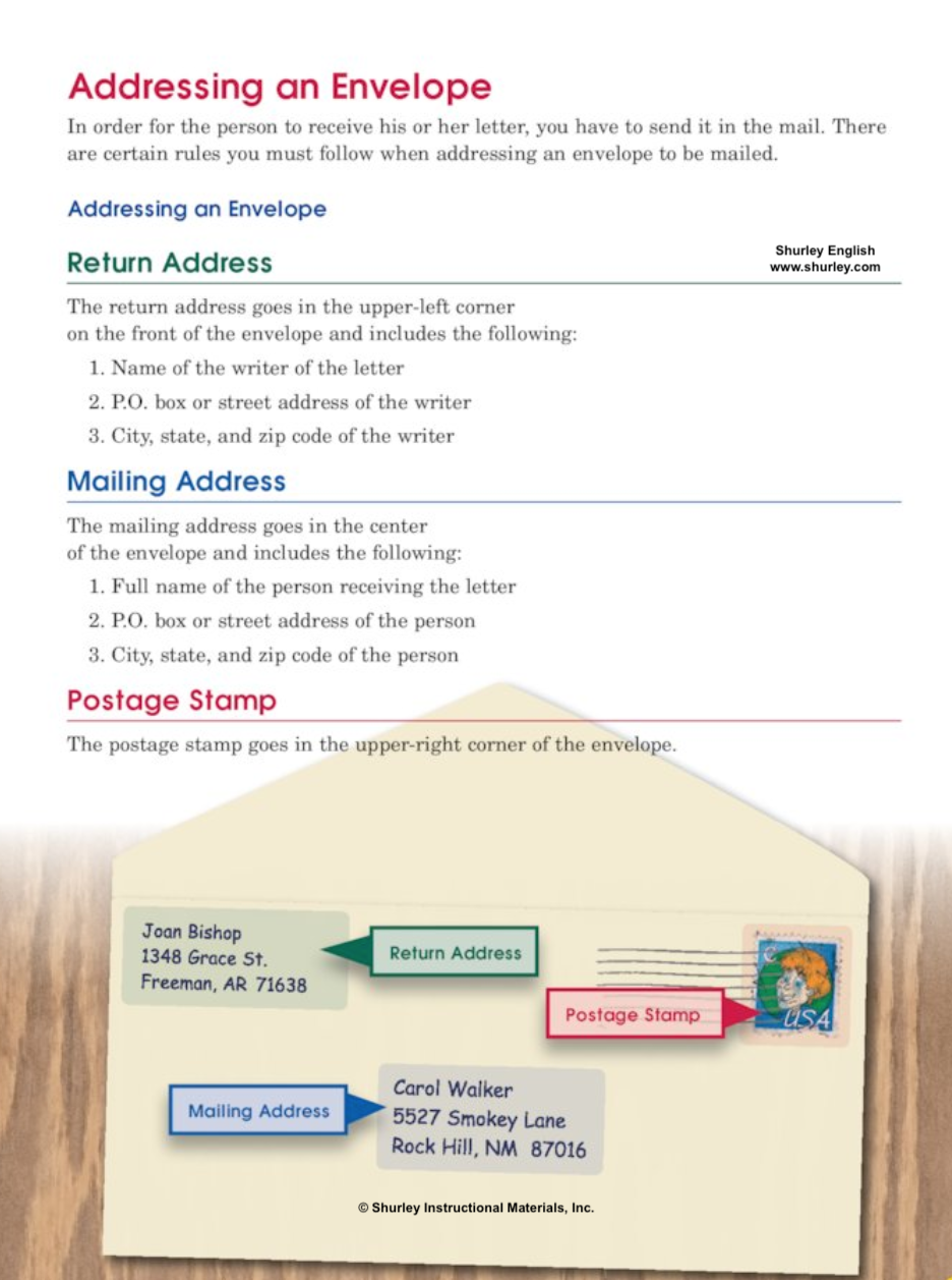 - Have students address an envelope to the recipient of their letter. Provide them with a visual of what information is needed.
